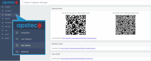 The Get Clients tab provides installation files for client applications, including the Alarm Monitor Client for Windows and Linux.